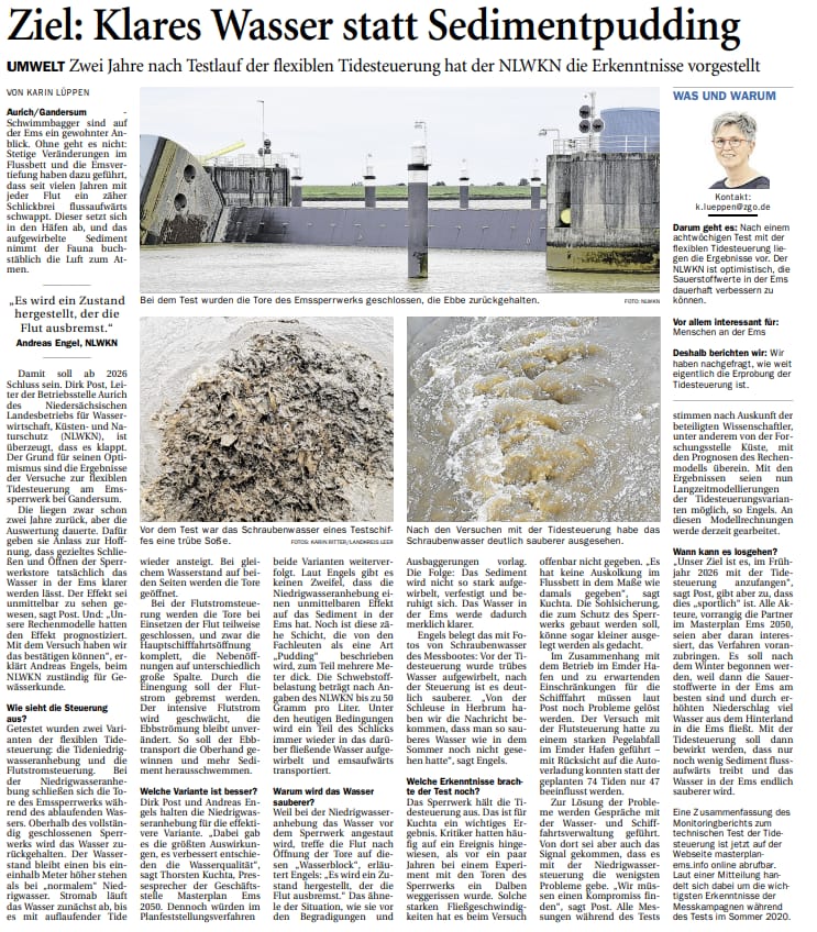 Zeitungsartikel aus der noz.de von Karin Lüppen zum Thema: Klares Wasser statt Sedimentpudding in der Ems.